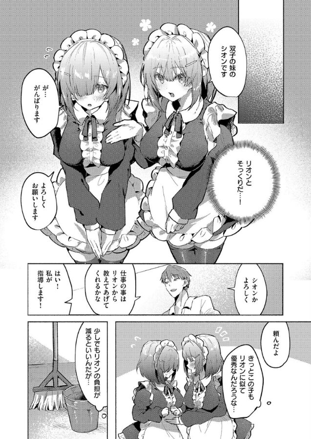 しごできメイド・リオンの働きすぎを危惧して、屋敷の主人は新しくメイドを雇うことに。そこでリオンが双子の妹・シオンが新たなメイドとして加わるが、姉に似て優秀かと思いきやシオンは真逆の超ドジっ子だったーー!ある日、ミスをしてしまったシオンは、どんな罰でも受けると言ってご主人のズボンを下ろしはじめ…!?えちえちキュートの新星★ とろろ岩塩先生描くあまあま双子3Pえっち♪