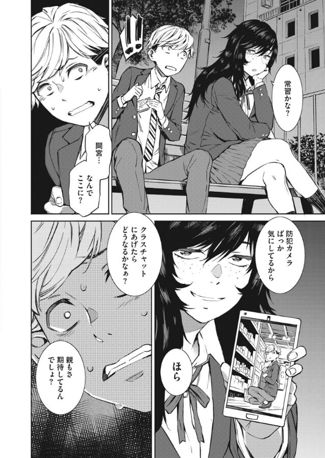 どうしてこんなことになってしまったのか…。ダンス大会で優勝、学年模試でも成績優秀なタカマツは、廃ホテルの一室で拘束され、間宮さんにフェラチオされている。きっかけは、予備校のテストでミスり、むしゃくしゃした帰りに万引きをしたところを、間宮さんに撮られていたからだ。脅されたタカマツは間宮さんに性器を弄ばれ…。