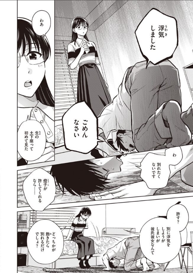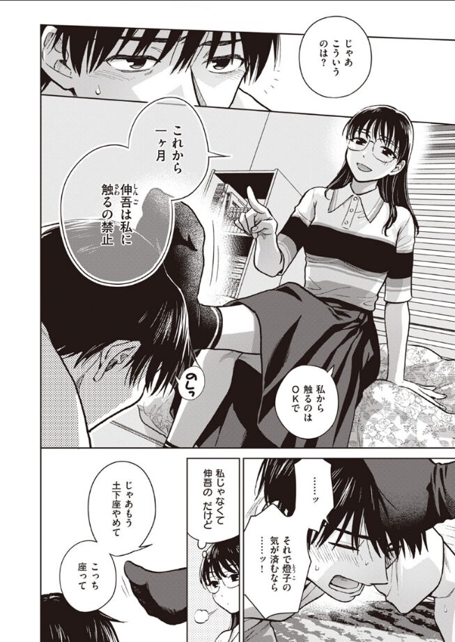 「これから一ヶ月、伸吾(しんご)は私に触るの禁止」彼女の燈子(とうこ)に浮気がバレてしまった……!!それにも関わらず冷静で怒らず咎めようともしない彼女に対し伸吾は自ら罰を求めるのだが……待っていたのは焦らされまくりの寸止めおしおき愛撫だった!!
