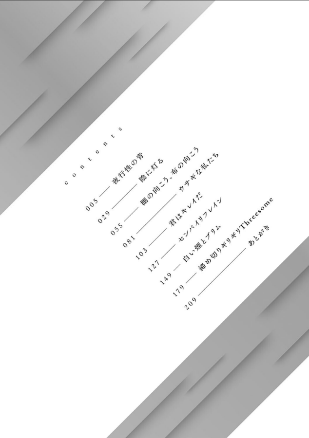夜の学校、閑静な図書室、大学の喫煙所、ふと踏み入った路地裏──。出会って、好きになり、重なる私たち。男女の等身大で繊細な演出と、吐息入り混じる熱烈な交わりに酔いしれる、エモ×エロ度数超UPで贈るスピリタス太郎の2ndコミックス!『陰に灯る』『棚の向こう、布の向こう』『ウサギな私たち』『君はキレイだ』『センパイリフレイン』には描き下ろしアフターエピソードを収録!【収録作品】・夜行性の青・陰に灯る・棚の向こう、布の向こう・ウサギな私たち・君はキレイだ・センパイリフレイン・白い煙とブリム・締め切りギリギリThreesomeさらにデジタル特装版には『夜行性の青』後日談『夜から覚めて』を追加収録!