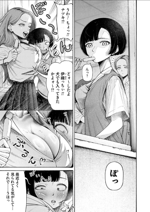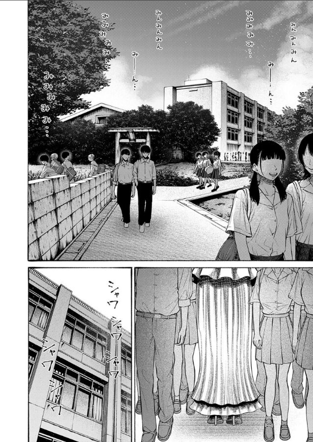 夏、城田(しろた)が今日学校に来ていなかった。どうやらしばらく休むらしい。ビッチギャルのナツキは、童貞だから八尺様に襲われたのではないかとふざける。自慢の爆乳に伊織(いおり)の顔を押しつけて。伊織は女を生かしてナツキのおっぱいを制服の上から揉む。